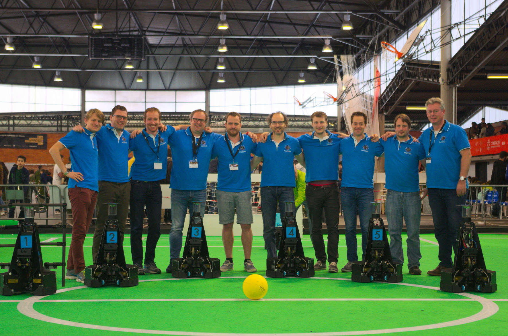 Since the last World Championships in July, the team has shown sustained effort to improve both the hardware and software for the six soccer robots. For instance, a new world model (which keeps track of known objects on the field) has been developed, featuring enhanced localization and tracking of the robots, ball and obstacles. As the robots also drive more precisely, they are now able to properly pass the ball to each other autonomously. This proved necessary indeed, as a recently introduced rule obliges the robots to do at least one pass before being allowed to score.